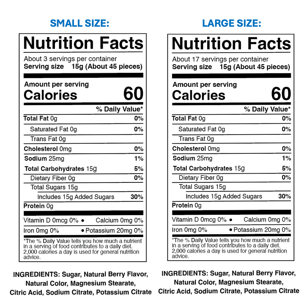 - Ingredients: Sugar, Natural Berry Flavor, Natural Color, Magnesium Stearate, Citric Acid, Sodium Citrate, Potassium Citrate; Caffeine Free
